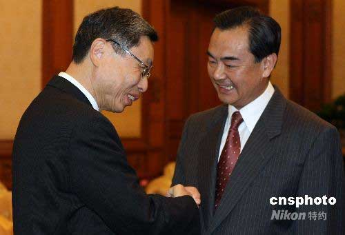 6月12日晚,新任中臺辦、國臺辦主任王毅(右)在北京釣魚臺會見并宴請臺灣海峽交流基金會董事長江丙坤一行。會見時,王毅與;鶗倍麻L高孔廉親切交談。中新社發(fā) 任晨鳴 攝