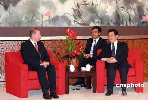 8月4日晚,中國國家主席胡錦濤在北京會(huì)見國際奧委會(huì)主席羅格等國際奧委會(huì)貴賓。中新社發(fā) 廖文靜 攝