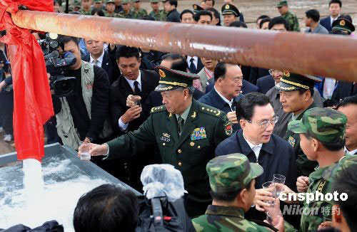 9月24日,寧夏回族自治區(qū)成立50周年慶;顒又醒氪韴F(tuán)團(tuán)長賀國強(qiáng)率一分團(tuán)到固原市慰問,在寧夏軍區(qū)給水團(tuán)正在打井的工地,賀國強(qiáng)拿起水杯同在場的民眾共同暢飲剛剛出井的“幸福水”。為幫助解決寧南山區(qū)和中部干旱帶用水困難,寧夏軍區(qū)組織給水團(tuán)實施新一輪“百井支農(nóng)富民”工程,初步解決近5萬人用水問題。中新社發(fā) 廖攀 攝