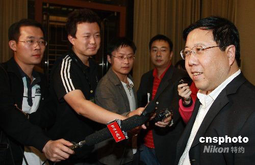 “長征二號(hào)F”運(yùn)載火箭總設(shè)計(jì)師荊木春在機(jī)場接待廳被記者追蹤采訪。