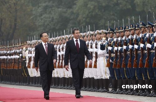 10月22日,中國國務院總理溫家寶在北京人民大會堂東門外廣場舉行儀式,歡迎丹麥首相拉斯穆森。中新社發(fā) 盛佳鵬 攝