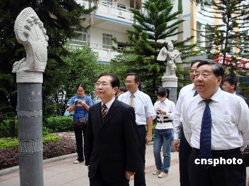 圖為中國法學(xué)會(huì)副會(huì)長(zhǎng)李清林(右)、廣西壯族自治區(qū)副主席高雄(左)出席開班典禮并參觀中國—東盟法律文化廣場(chǎng)。