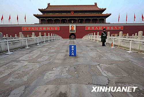 據(jù)北京市文物局9日透露,為迎接2009年國(guó)慶60周年,確保游客和文物安全,北京市文物局已于近日啟動(dòng)了天安門(mén)金水橋加固修繕工程,整個(gè)工程預(yù)計(jì)將于2009年5月完工。天安門(mén)金水橋是整個(gè)天安門(mén)景觀的重要組成部分,因游客眾多以及風(fēng)化等自然因素,天安門(mén)金水橋橋面此前多處出現(xiàn)破損,欄桿部分也出現(xiàn)裂縫,存在一定的安全隱患。新華社記者羅曉光攝