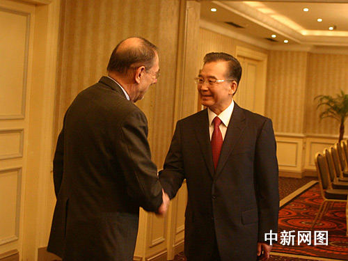 正在這里對歐盟總部進行正式訪問的中國總理溫家寶,當?shù)貢r間一月三十日上午在下榻飯店會見了歐盟理事會秘書長兼共同外交與安全政策高級代表索拉納(左)。雙方對中歐關系重要性均給予高度肯定。張朔 攝
