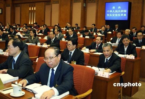 2月28日上午,十一屆全國人大常委會(huì)第七次會(huì)議在北京人民大會(huì)堂舉行閉幕會(huì),以158票贊成、3票反對、4票棄權(quán)通過倍受關(guān)注的《中華人民共和國食品安全法》。中新社發(fā) 任晨鳴 攝