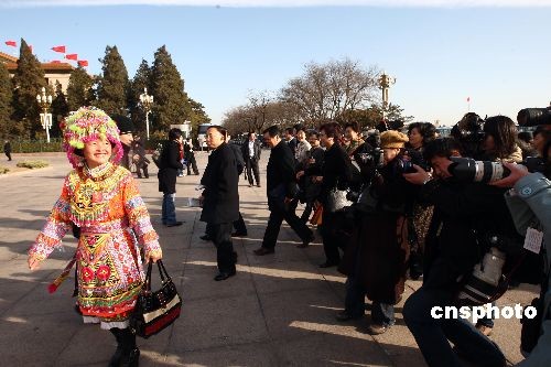 3月9日,十一屆全國(guó)人大二次會(huì)議在人民大會(huì)堂舉行第二次全體會(huì)議,穿著亮麗民族服飾的女代表成為攝影記者追逐的對(duì)象。中新社發(fā) 杜洋 攝