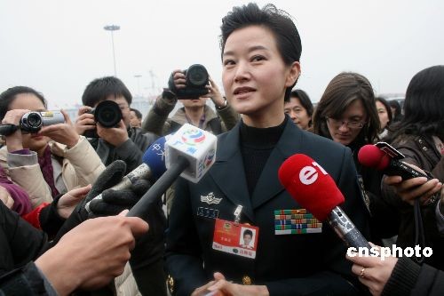 3月12日,全國(guó)政協(xié)十一屆二次會(huì)議閉幕。圖為政協(xié)委員宋祖英出席閉幕會(huì)后被記者包圍采訪。中新社發(fā) 金立冬 攝