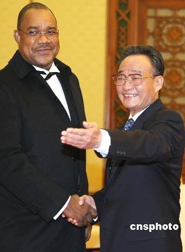 3月23日下午,中國(guó)全國(guó)人大常委會(huì)委員長(zhǎng)吳邦國(guó)在北京人民大會(huì)堂會(huì)見(jiàn)來(lái)訪的塞舌爾國(guó)民議會(huì)議長(zhǎng)帕特里克·赫米尼耶一行。中新社發(fā) 任晨鳴 攝