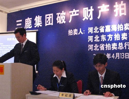 4月13日,由河北省嘉海拍賣有限公司作為主拍單位,與河北省東方拍賣有限公司、河北省拍賣總行有限公司共同進(jìn)行拍賣三鹿集團(tuán)部分資產(chǎn)。當(dāng)日拍賣的11項(xiàng)破產(chǎn)財(cái)產(chǎn),競(jìng)買人顯然無意出手,其中天津三鹿乳業(yè)51%的股權(quán)竟叫出20萬元的起拍價(jià),最終也無人問津,三鹿集團(tuán)第4批破產(chǎn)財(cái)產(chǎn)全部流拍。中新社發(fā) 翟羽佳 攝
