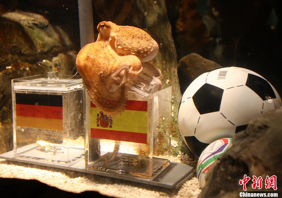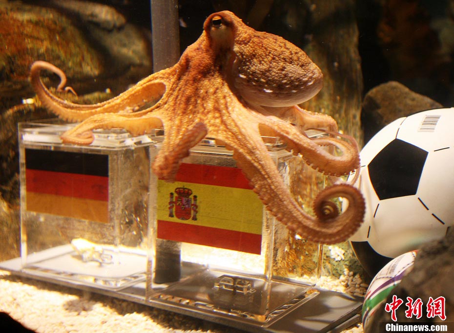 7月6日下午,德國某水族館的章魚保羅再次出動,對世界杯半決賽德國與西班牙進行了預測,最終他選擇了西班牙。保羅認為歐洲冠軍西班牙將在半決賽擊敗勢頭強勁的德國隊進入決賽!秷D片報》網站的直播員在公布結果的同時說道:“希望勒夫的小伙子們能扭轉局勢,拯救這場半決賽。”或許,對于德國球迷來說還有一個自我安慰的理由:保羅在2008年歐錦賽上預測的準確率是80%,并且唯一錯的就是決賽與西班牙之戰(zhàn)。他們或許已經開始期待:兩年后的世界杯預測不要百發(fā)百中,至少在半決賽時錯一次。