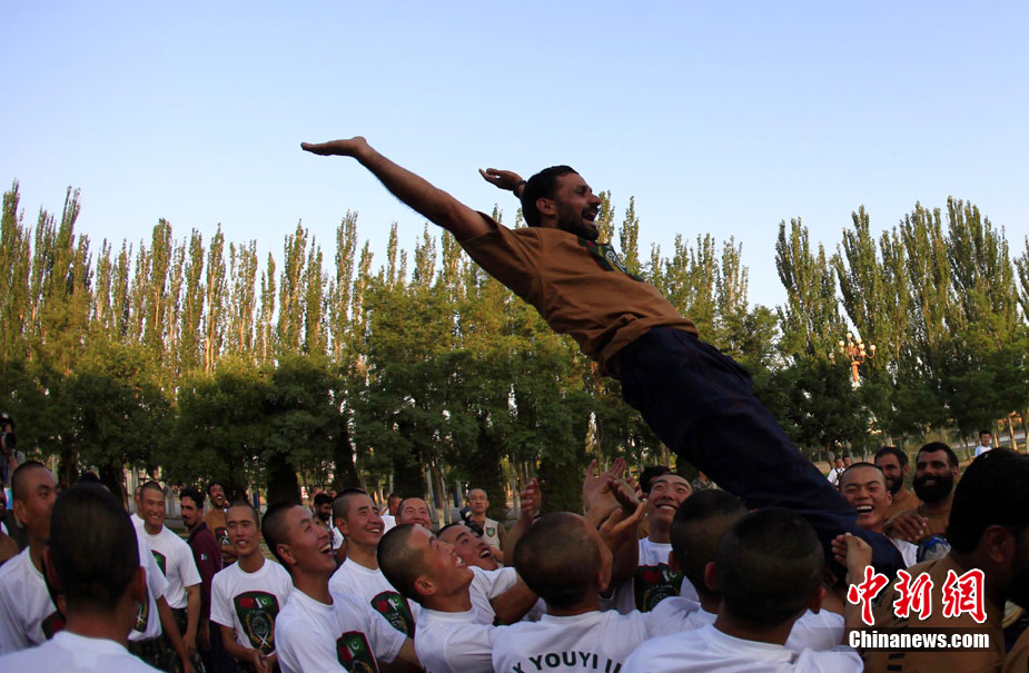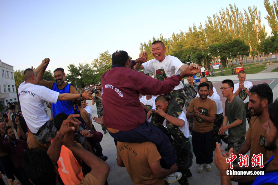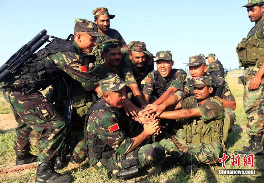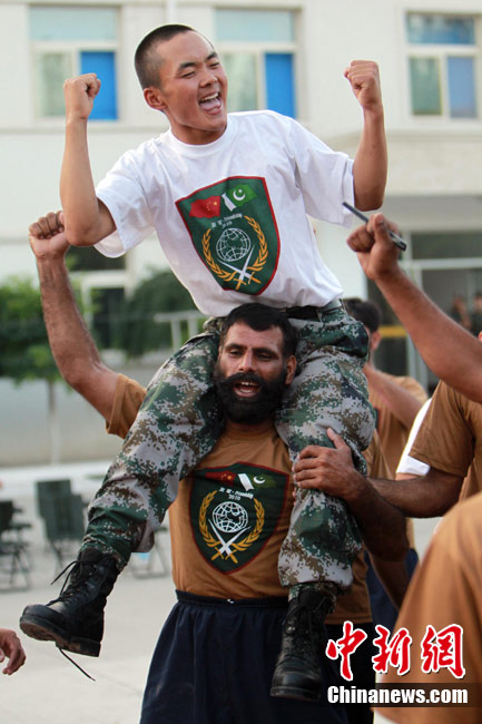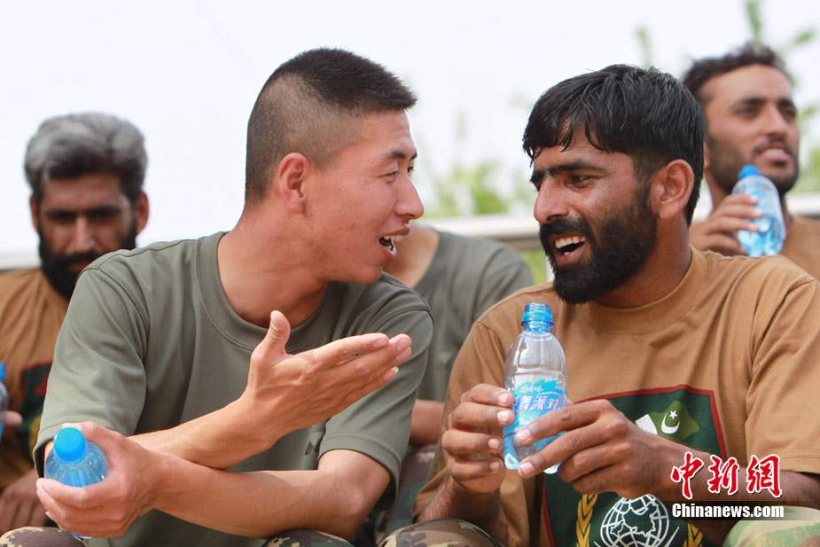 7月初,代號“友誼—2010”的中國巴基斯坦反恐聯(lián)合訓(xùn)練在中國寧夏青銅峽地區(qū)展開,此次訓(xùn)練主要以邊境地區(qū)山地聯(lián)合反恐作戰(zhàn)為課題。開訓(xùn)以來,參訓(xùn)官兵每天不論是訓(xùn)練交流還是開展文體活動,都混編為A連和B連為單位組織實施,盡管語言溝通并不暢通,但中巴兩國士兵在手勢和眼神的幫助下,依然能夠協(xié)作訓(xùn)練默契自然,完成動作標(biāo)準(zhǔn)規(guī)范。中新社發(fā) 杜洋 攝