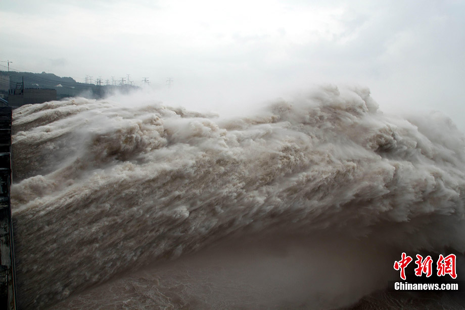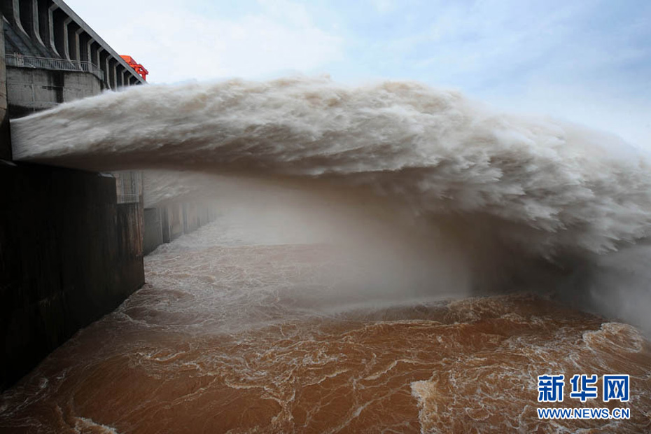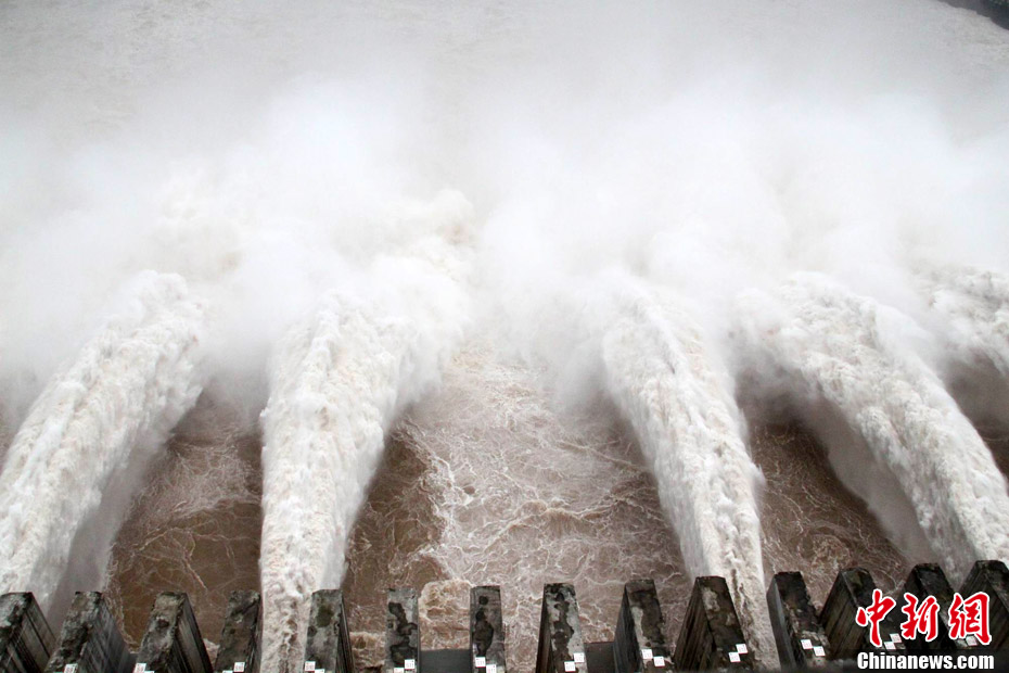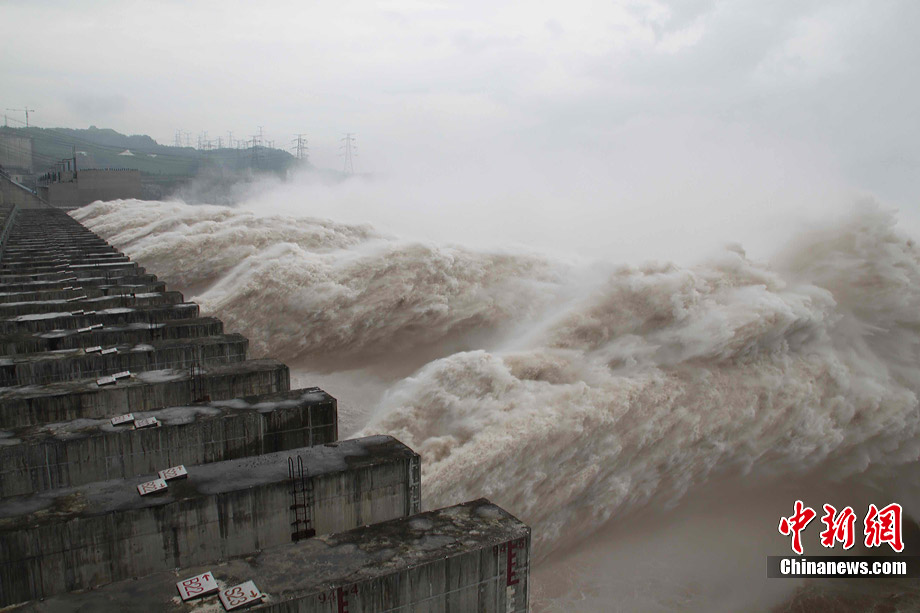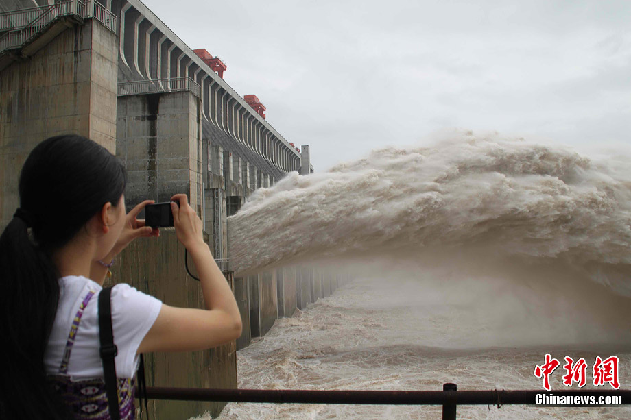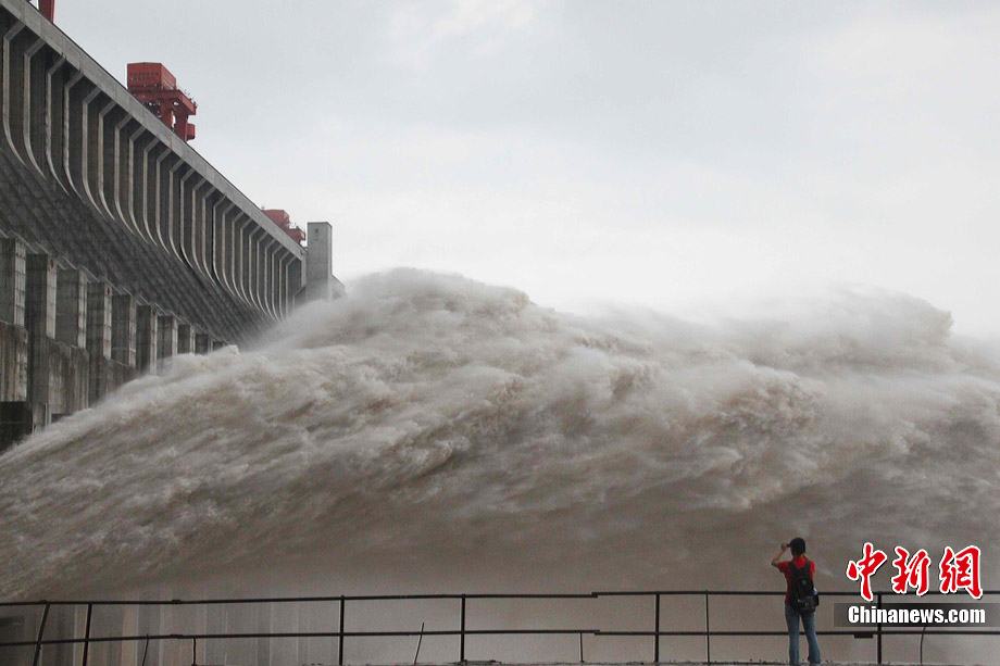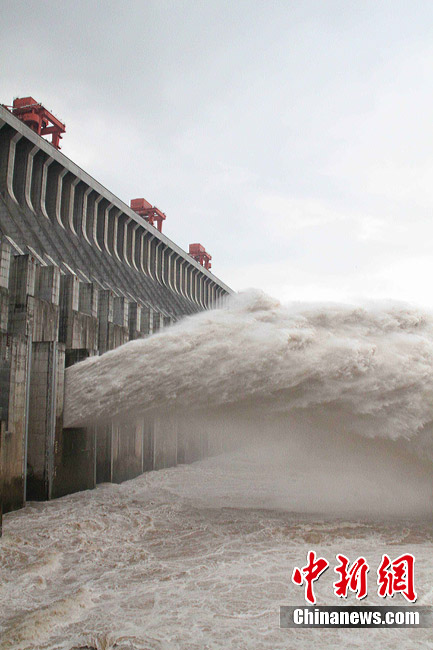 7月20日8時,峰值為7萬立方米/秒的洪水抵達(dá)三峽大壩。這是三峽工程建成后的首次大規(guī)模洪峰。大壩共開啟9個泄洪深孔,將洪水下泄流量控制在4萬立方米/秒左右,削減了4成多的洪峰下泄流量。中新社發(fā) 劉良偉 攝