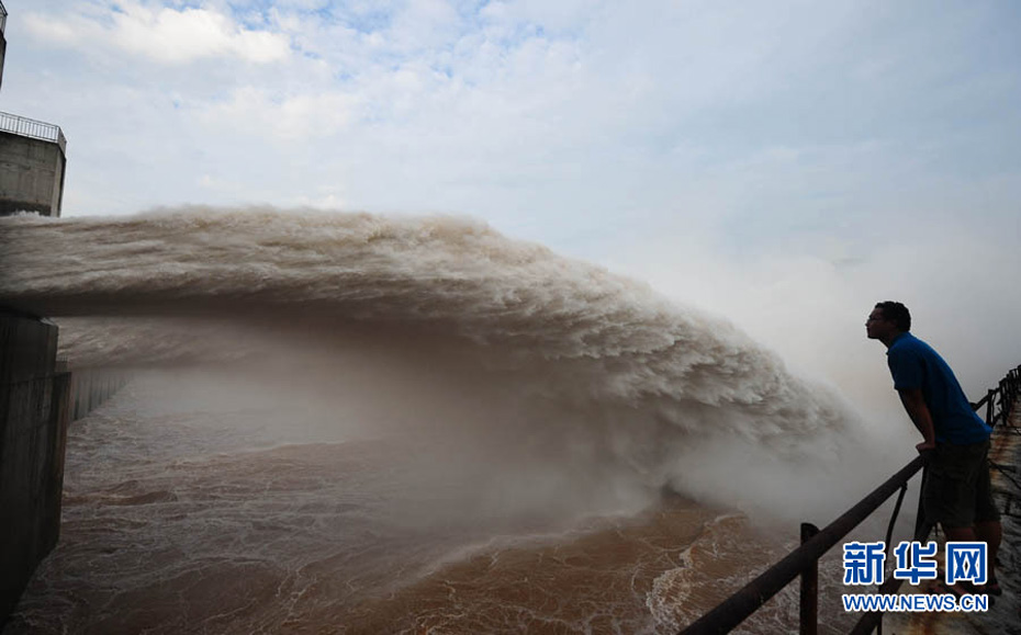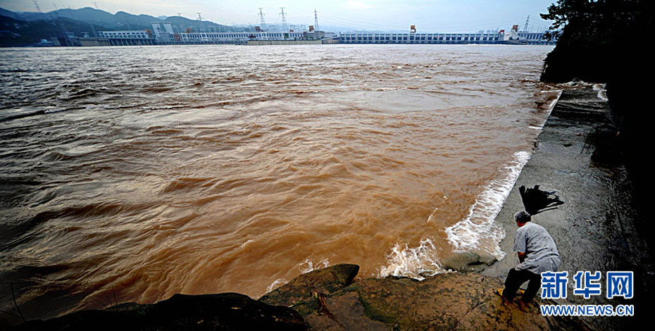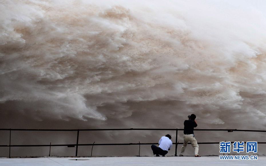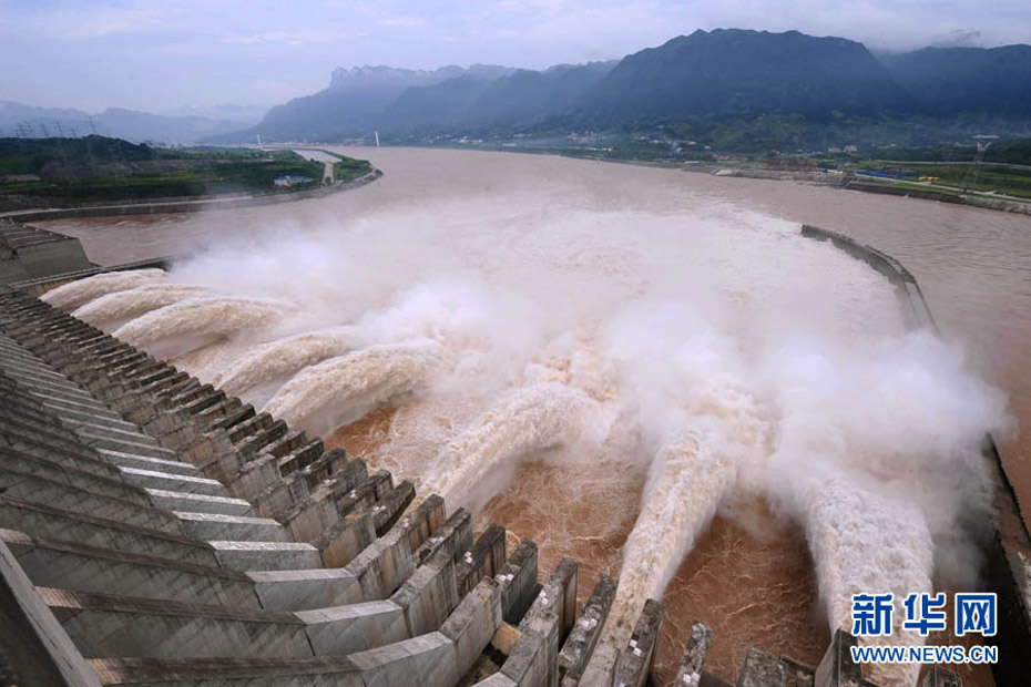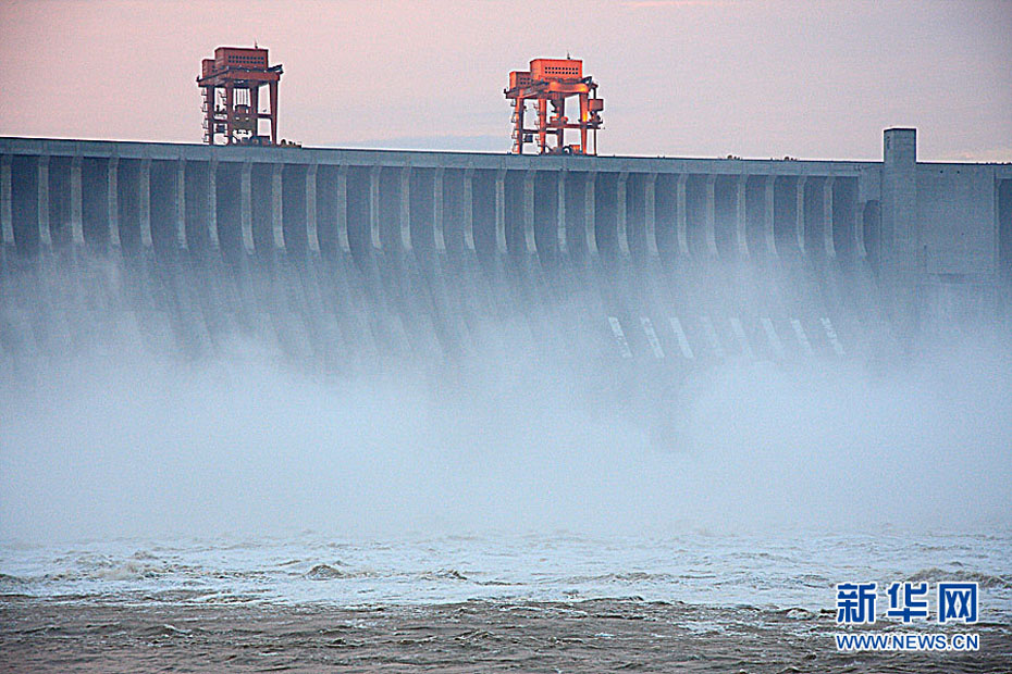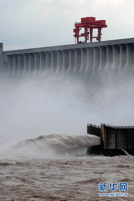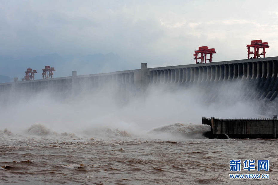 7月20日8時,峰值為7萬立方米/秒的洪水抵達(dá)三峽大壩。這是三峽工程建成后的首次大規(guī)模洪峰。大壩共開啟9個泄洪深孔,將洪水下泄流量控制在4萬立方米/秒左右,削減了4成多的洪峰下泄流量。中新社發(fā) 劉良偉 攝