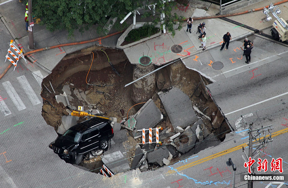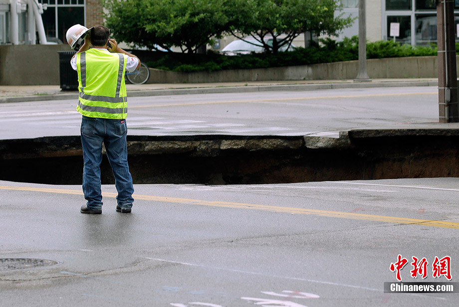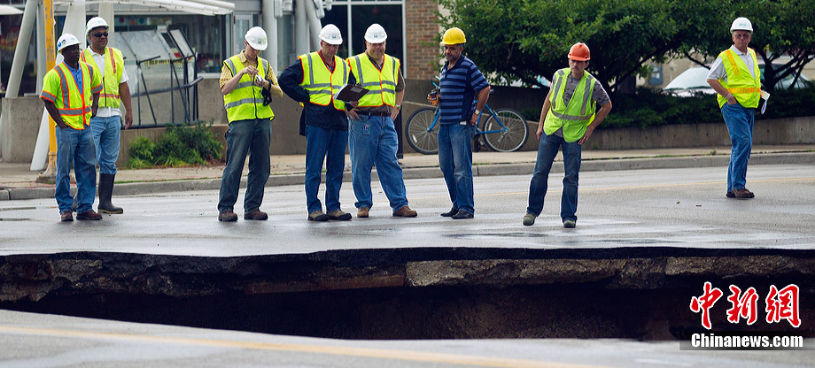 當(dāng)?shù)貢r(shí)間7月23日,美國(guó)南部威斯康星州遭遇強(qiáng)烈暴風(fēng)雨襲擊,造成當(dāng)?shù)亟值赖孛嫠莩霈F(xiàn)大洞,路過(guò)的汽車不慎掉入洞中。暴風(fēng)雨還造成當(dāng)?shù)囟嗵幒樗簽E。