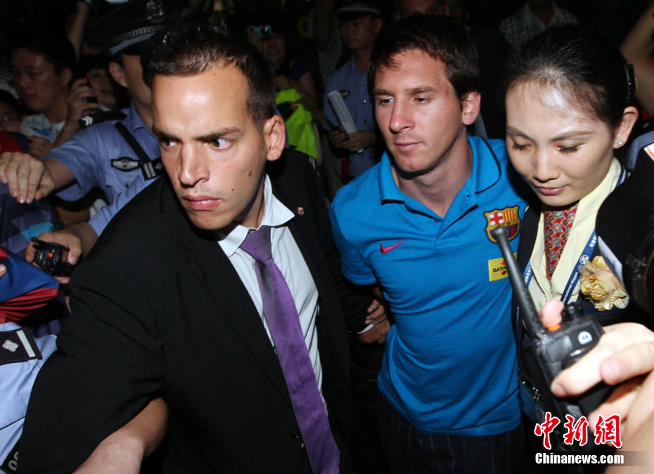 8月5日凌晨,巴薩全隊(duì)乘機(jī)從首爾飛抵北京,在首都國(guó)際機(jī)場(chǎng)的T3航站樓,西甲冠軍受到了數(shù)百名中國(guó)球迷的熱烈歡迎。梅西和伊布的到來(lái),讓深夜的首都機(jī)場(chǎng)處于一片沸騰之中。圖為梅西艱難突出重圍。 中新社發(fā) 杜洋 攝