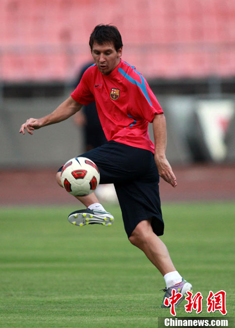 8月6日,巴塞羅那俱樂部在北京工人體育館進行了第二次公開訓(xùn)練課,眾多巴薩球迷也在現(xiàn)場目睹了球隊風(fēng)采。圖為梅西出場表情輕松。中新社發(fā) 杜洋 攝