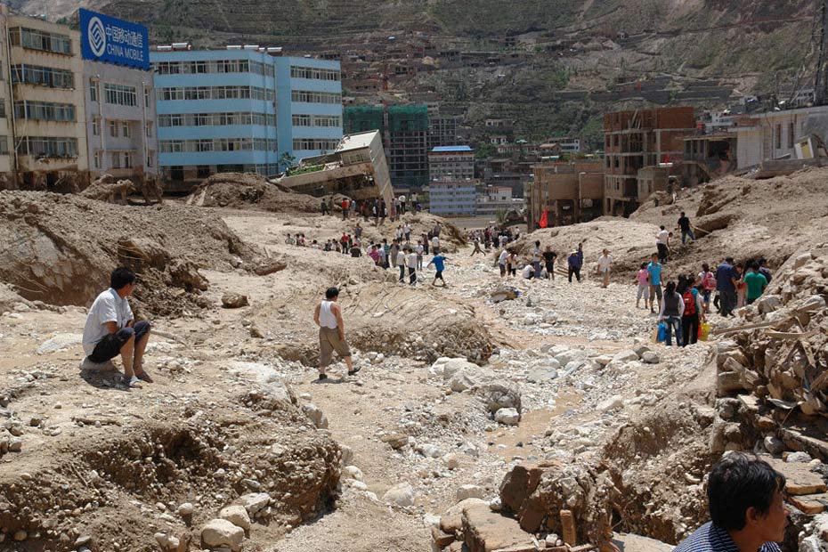 8月7日22時許,甘南藏族自治州舟曲縣突降強降雨,縣城北面的羅家峪、三眼峪泥石流下泄,由北向南沖向縣城,造成沿河房屋被沖毀,泥石流阻斷白龍江、形成堰塞湖。截至當日16時統(tǒng)計,泥石流災(zāi)害已造成127人死亡,76人受傷,近2000人失蹤,緊急轉(zhuǎn)移安置4.5萬人,倒塌房屋120余戶300余間。圖片來源 新華網(wǎng)