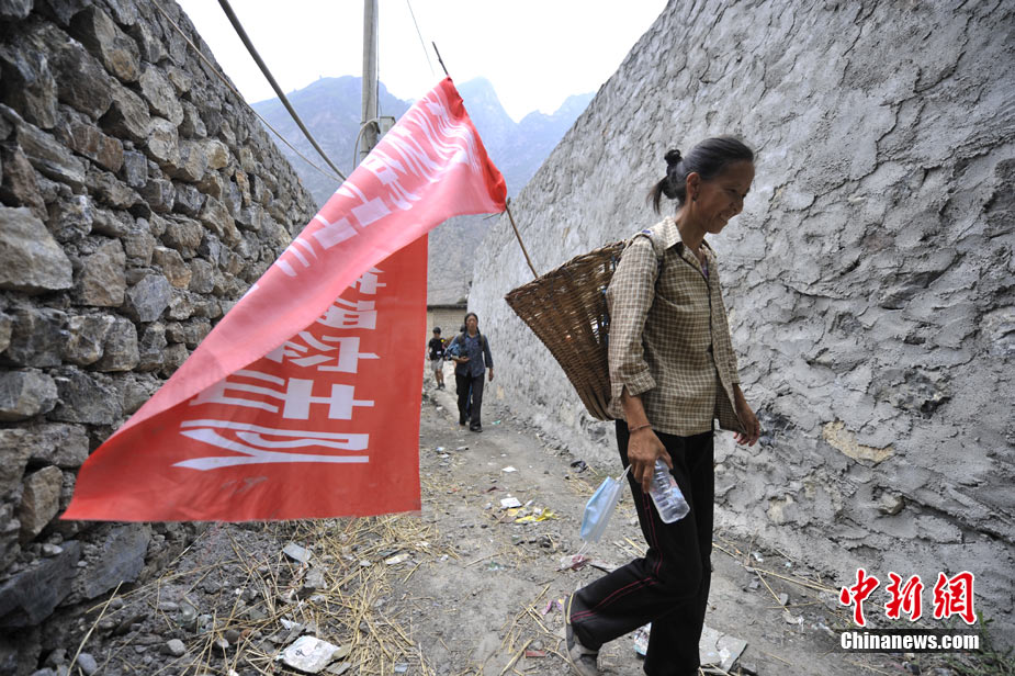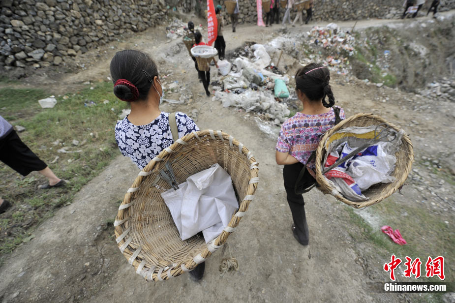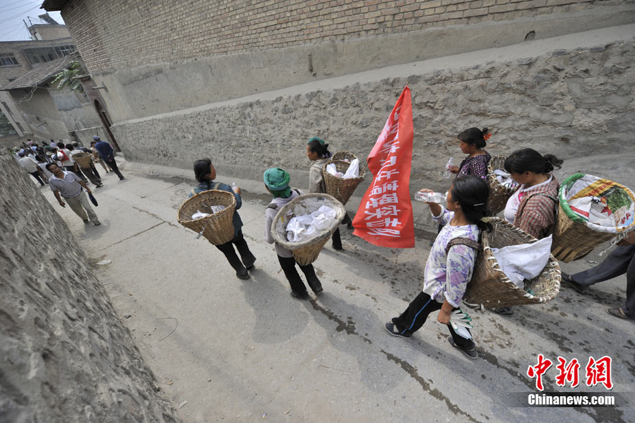清晨8時(shí)許,舟曲鎖兒頭村的王旻桂和姐妹們來到城區(qū)。今天,她們的任務(wù)是將城區(qū)的生活垃圾清運(yùn)出去。這是一支“背簍突擊隊(duì)”——“城區(qū)環(huán)境衛(wèi)生清理突擊隊(duì)”的旗幟在王旻桂的背簍上飄揚(yáng)!氨澈t”這種當(dāng)?shù)卮迕裼脕戆徇\(yùn)物品的日常工具,在救災(zāi)任務(wù)繁忙、交通不暢時(shí),成為“利器”。