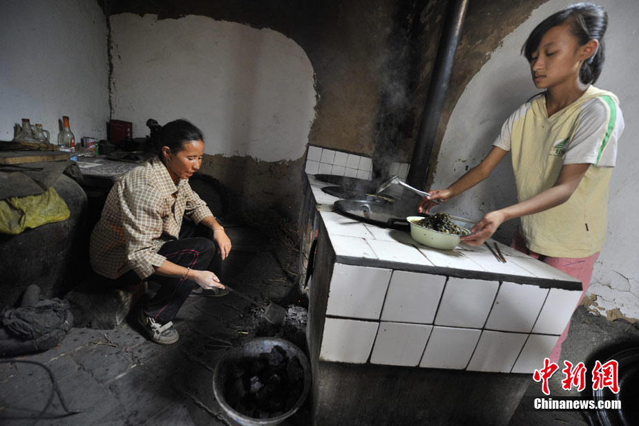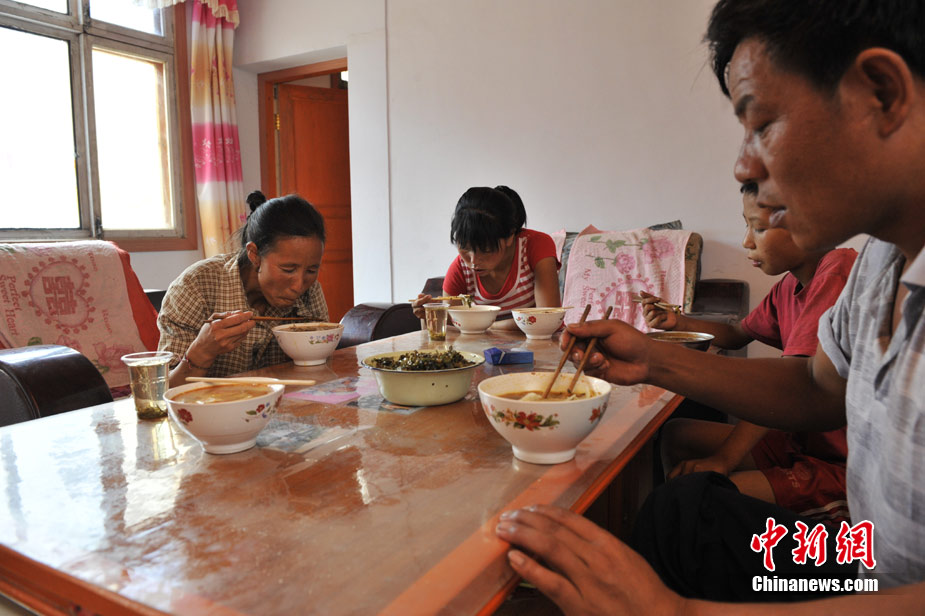 王旻桂所在鎖兒頭村,除了有輕微滑坡外,受到本次泥石流災(zāi)害的影響并不大,王旻桂家里還有存糧,在外打工的丈夫聽到災(zāi)難的消息,也趕了回來,一家人因?yàn)闉?zāi)難團(tuán)聚到一起!胞溩邮胀炅,在家也沒有事,過來幫幫忙。”面對(duì)記者,王旻桂并不善言辭。