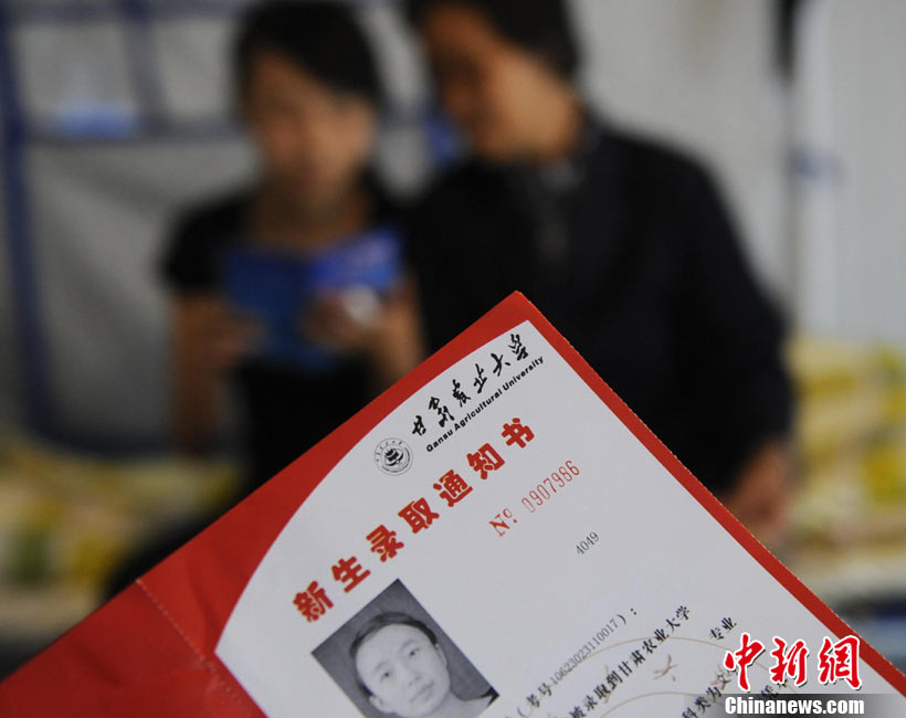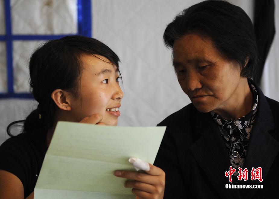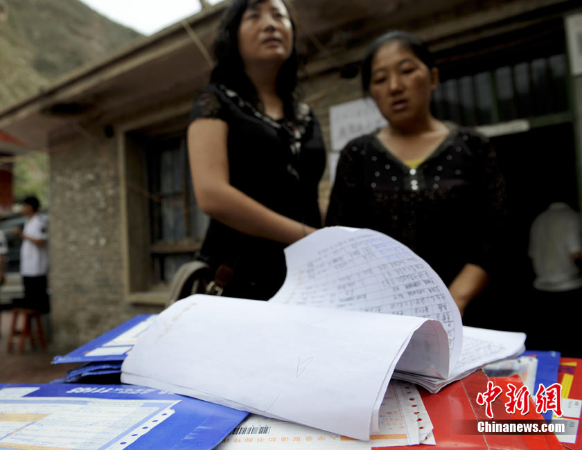 8月14日,甘肅舟曲災區(qū)的高考錄取通知書正在發(fā)放過程中,學生們接過火紅色的錄取通知書信封,眼里有藏不住的笑意。然而,有一些通知書卻永遠無法發(fā)出了。截至上午10點30分,舟曲一中收發(fā)室當天共發(fā)出7份錄取通知書,還有30多封正等待領取。中新社發(fā) 廖攀 攝
