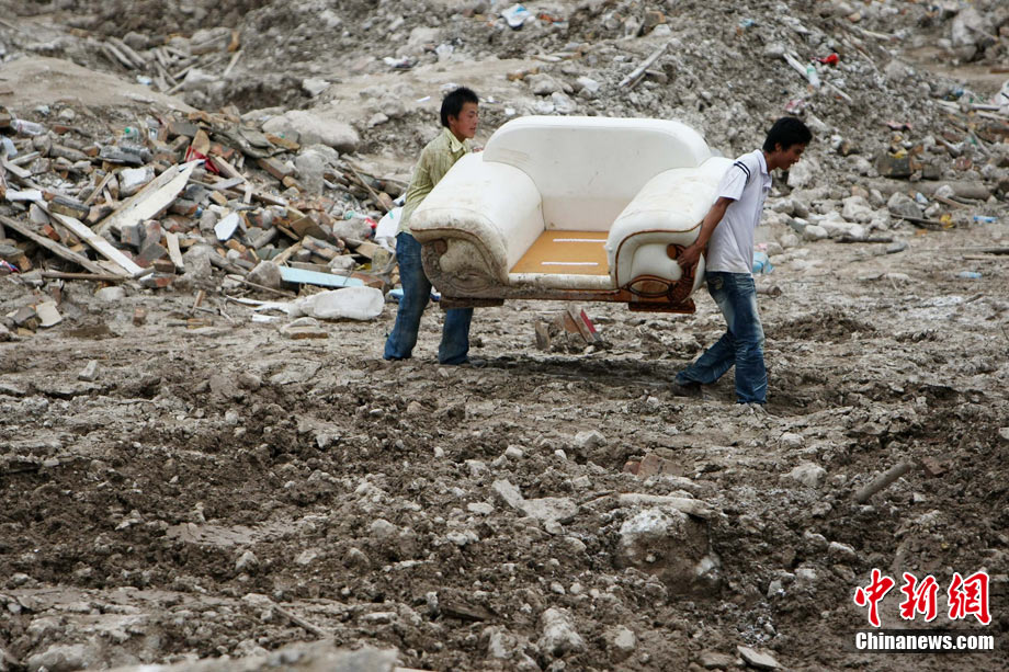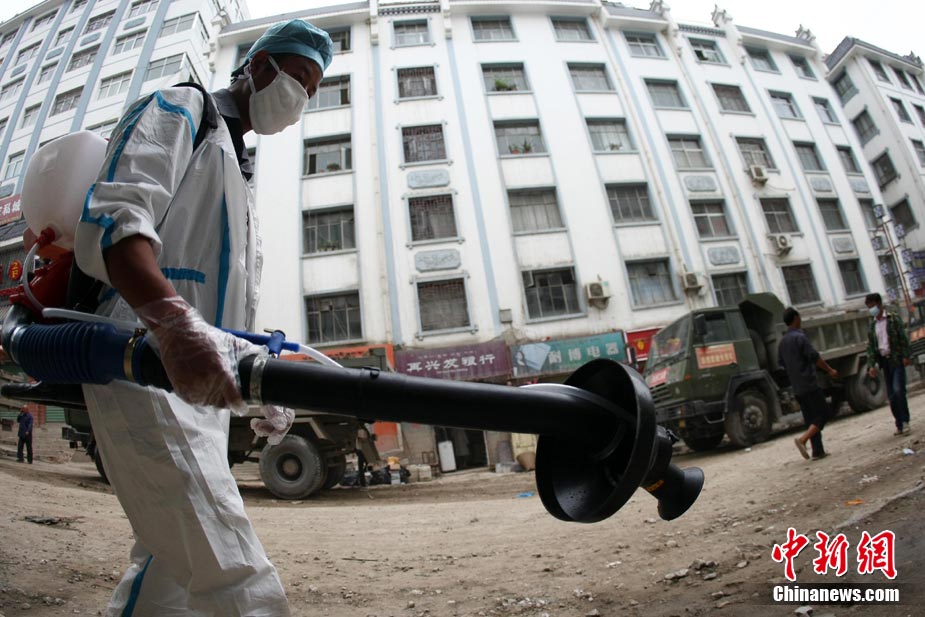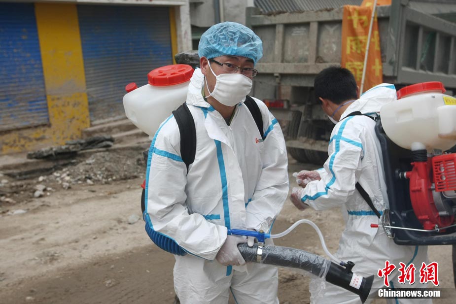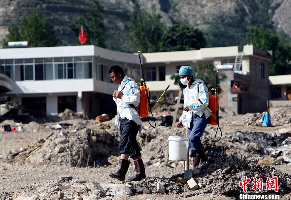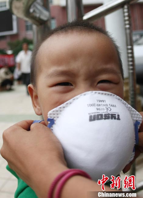 8月16日,甘肅舟曲泥石流災(zāi)區(qū),一歲大的女孩楊歡(左)、樂樂坐在臺階上,戴著大大口罩等待家人,楊歡的媽媽在這次特大泥石流災(zāi)害中不幸遇難。目前,舟曲災(zāi)區(qū)衛(wèi)生防疫工作在不斷加強,防疫人員每天至少對安置點進行1次全面消毒、殺蟲。對于食堂、垃圾場等重點部位每天至少消毒殺菌3次以上。 中新社發(fā) 杜洋 攝
