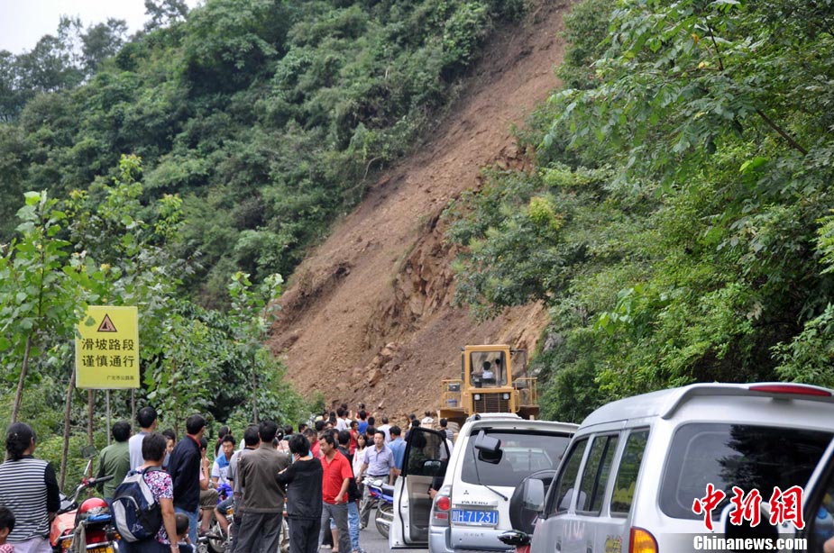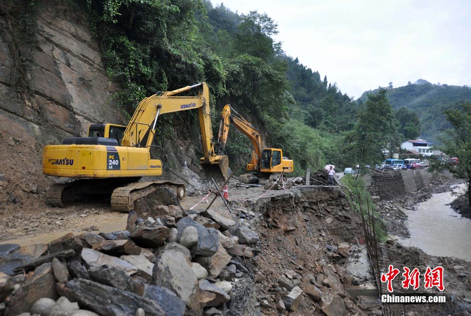 8月18日16時,四川省青川縣城前往蒿溪鄉(xiāng)的道路由于暴雨造成塌方,導致道路中斷,車輛通行受阻。現(xiàn)場由于再次出現(xiàn)大量山體垮塌,部分路段搶險工作被迫停止。中新社發(fā) 劉忠俊 攝