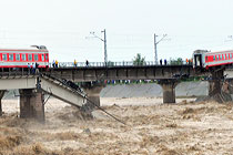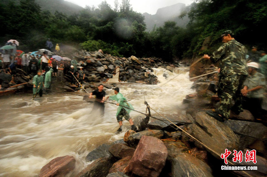 8月19日,河南省新鄉(xiāng)市輝縣市上八里鎮(zhèn)回龍村因橋梁被山洪沖塌造成民眾被困。截止19日21時30分許已經(jīng)營救出被困民眾80多人。但據(jù)被救人員反映,仍有40多人被困在更深處的山里。圖為消防官兵正加緊營救。 中新社發(fā) 河南消防 攝
