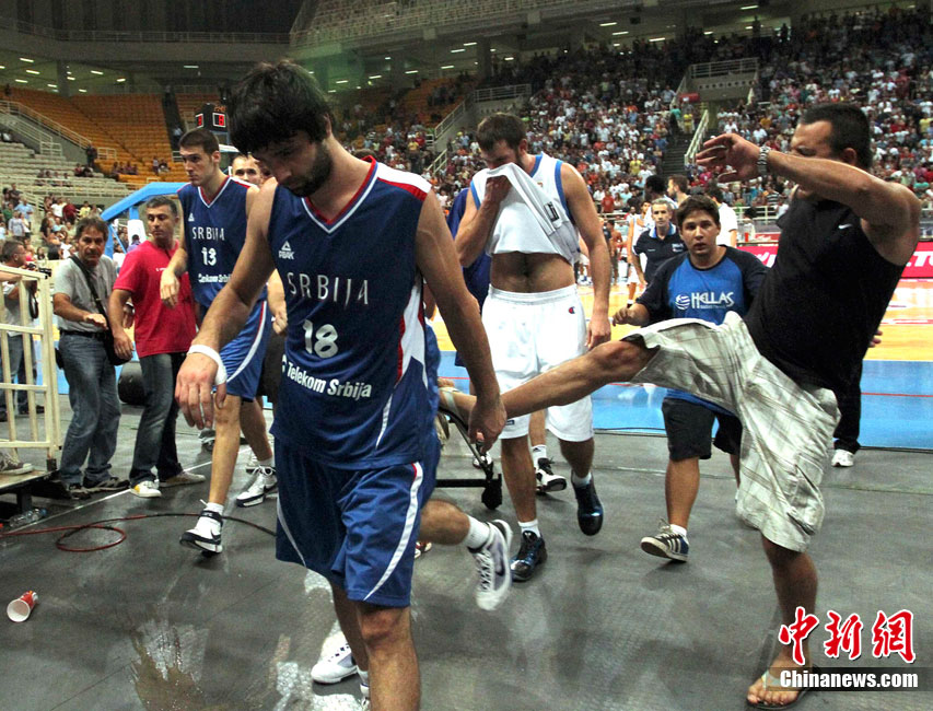 8月19日,在希臘舉行的雅典衛(wèi)城籃球四國(guó)賽中,塞爾維亞隊(duì)與希臘隊(duì)爆發(fā)沖突,裁判提前宣布比賽結(jié)束。圖為塞爾維亞隊(duì)球員克爾斯蒂奇(左)將椅子扔向希臘隊(duì)球員布魯西斯。