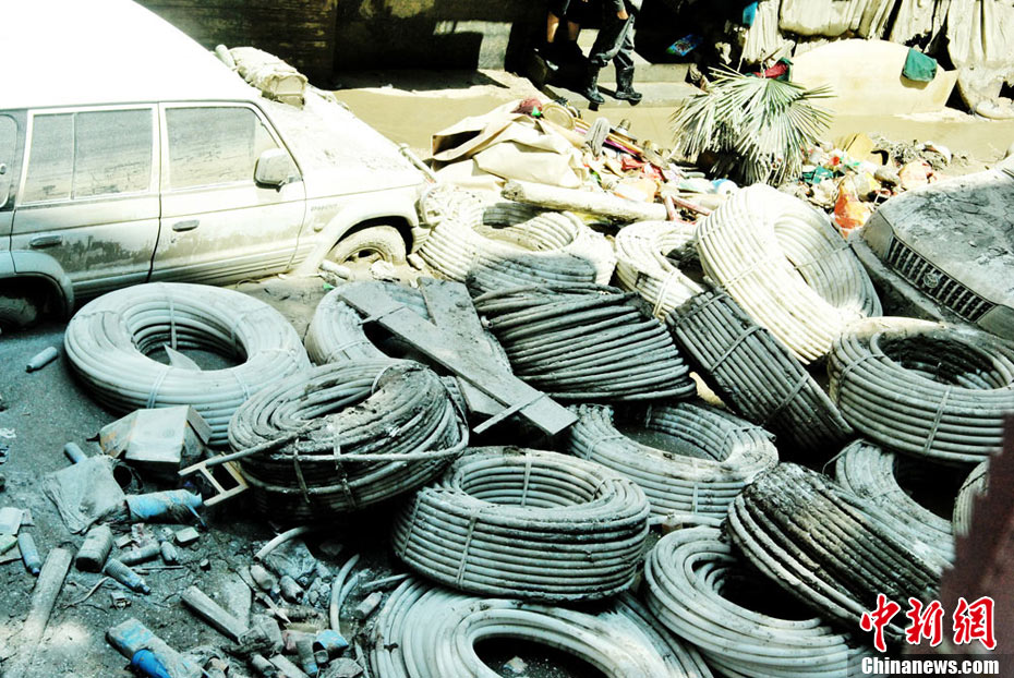 8月25日,隨著白龍江水位下降,舟曲縣城被淹沒的房屋逐漸退出水面,可以發(fā)現(xiàn),水退之處,淤泥滿地。中新社記者 侯志紅 攝