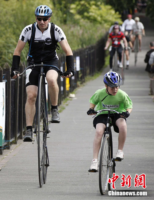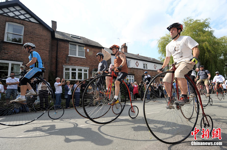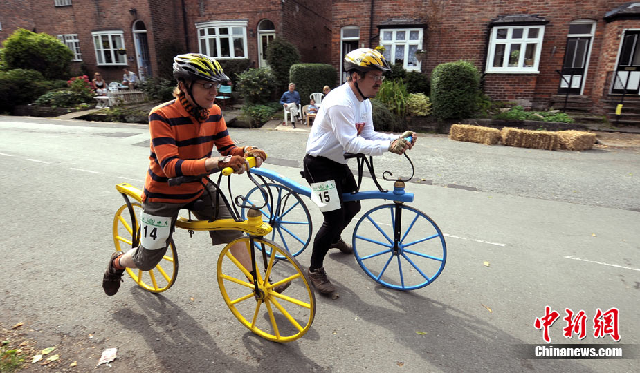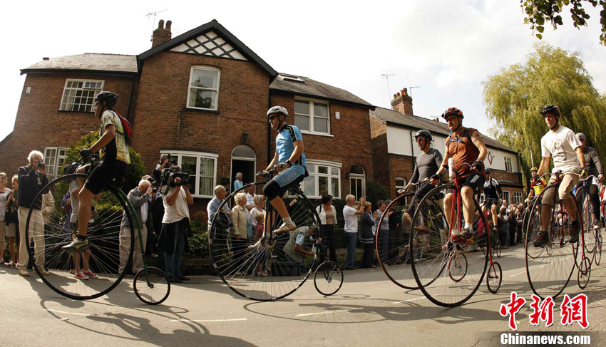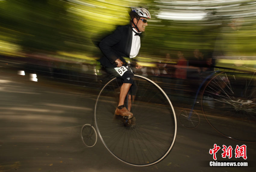 近日,英國大納茨福德舉行了復(fù)古自行車比賽。該項(xiàng)比賽每十年舉行一次,參賽者來自世界各地。他們須在三個(gè)小時(shí)的限時(shí)內(nèi)沿著一公里長的賽道進(jìn)行騎行比賽。