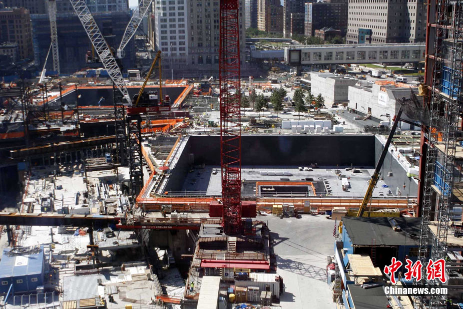 美國當地時間9月7日,記者在紐約世貿建筑工地現(xiàn)場看到,以原先世貿雙子塔樓基座為主體的兩個方形瀑布池業(yè)已成型,周圍也種上了些許綠樹。9·11紀念館館長喬·丹尼爾斯表示,肯定將在事件十周年紀念日當天開館。中新社記者 孫宇挺 攝