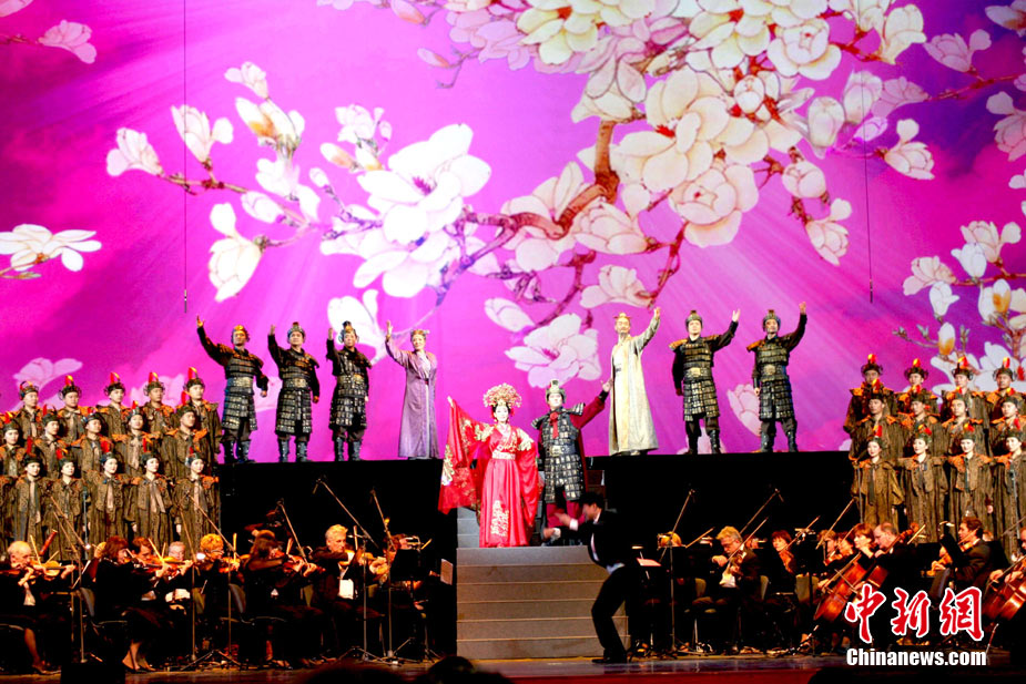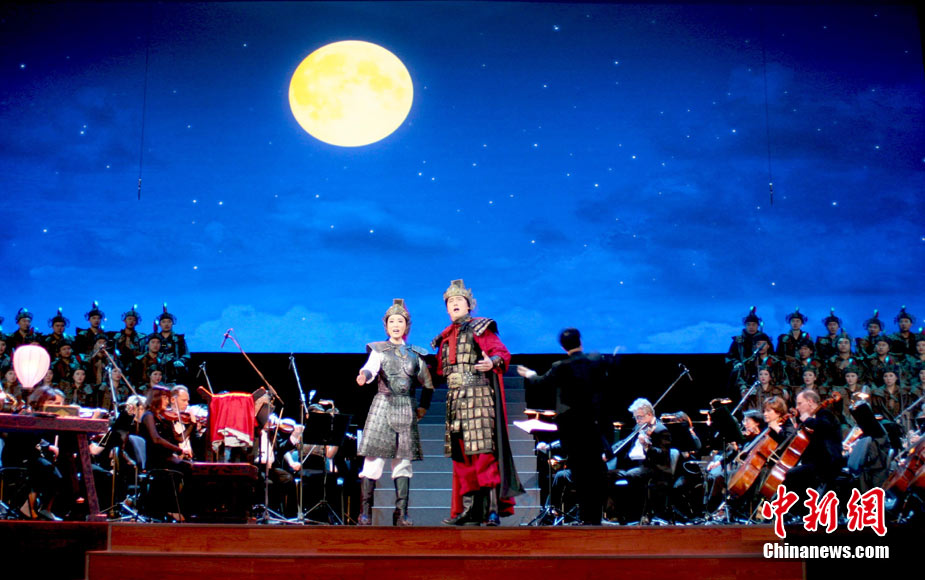 9月9日晚,中國人民解放軍總政治部歌舞團攜大型原創(chuàng)民族歌劇《木蘭詩篇》在莫斯科克里姆林宮大劇院成功演出。作為俄羅斯“漢語年”框架下的一項重要活動,此次赴俄首場演出由青年歌唱家譚晶出演花木蘭一角。中新社發(fā) 田冰 攝