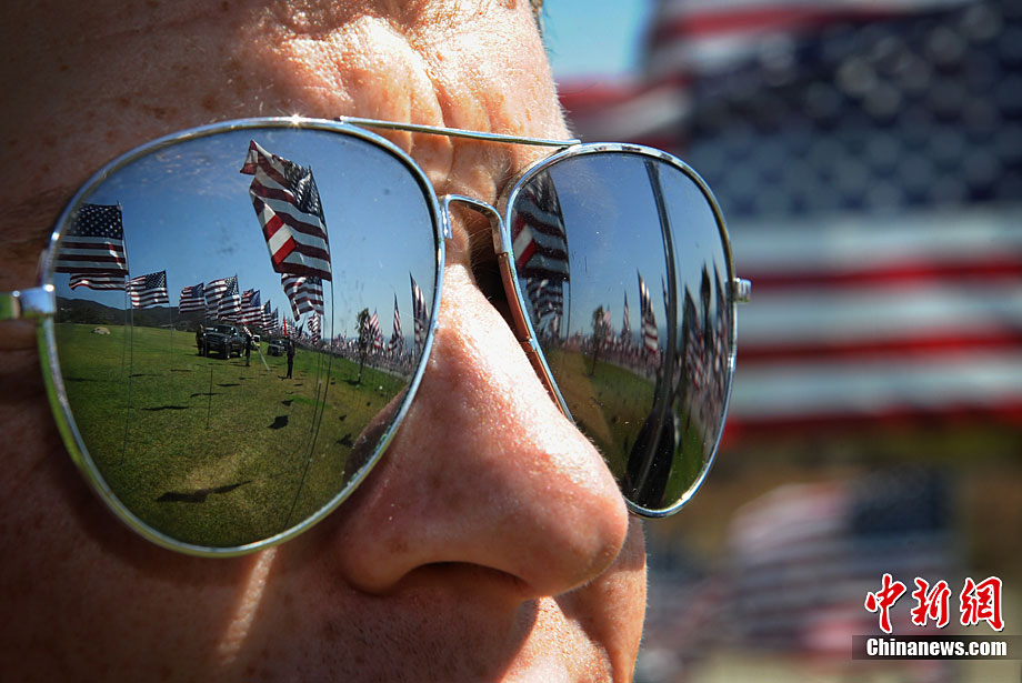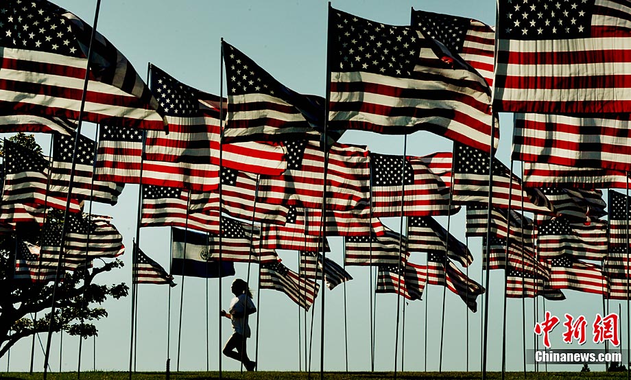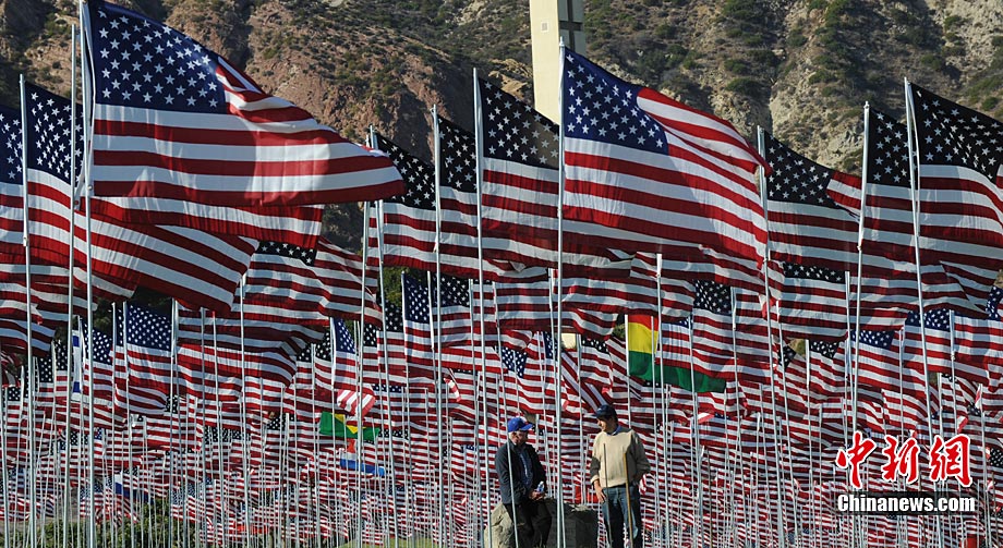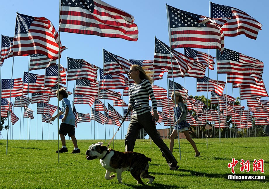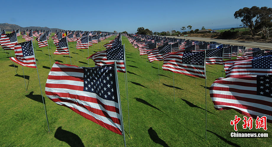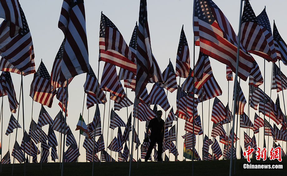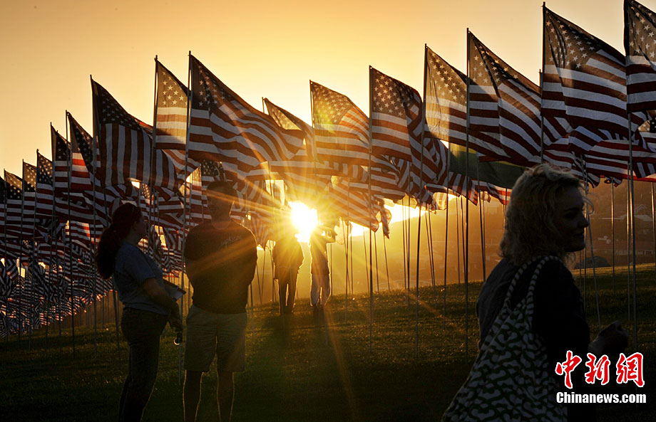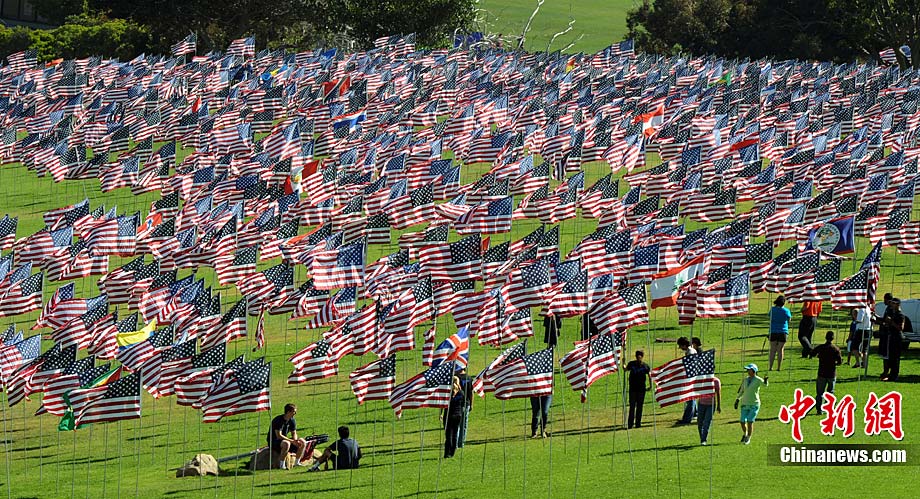 當?shù)貢r間9月10日,在美國加利福尼亞州的馬里布,一些大學生在馬里布佩珀代恩大學的草坪上插上近3000面美國國旗和其它國家和地區(qū)的旗幟,紀念“9·11”恐怖襲擊事件的遇難者。