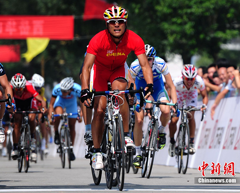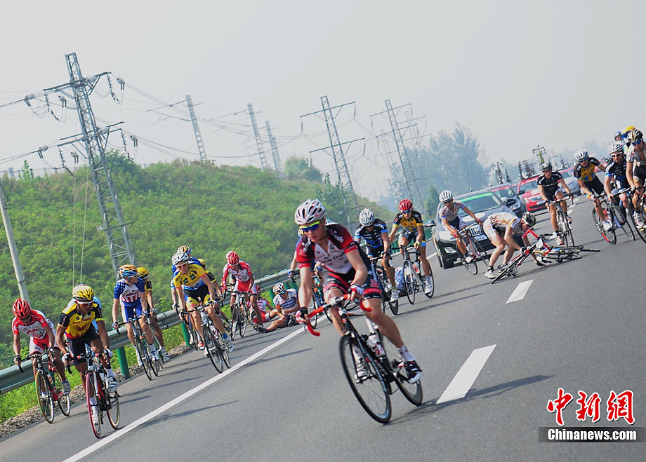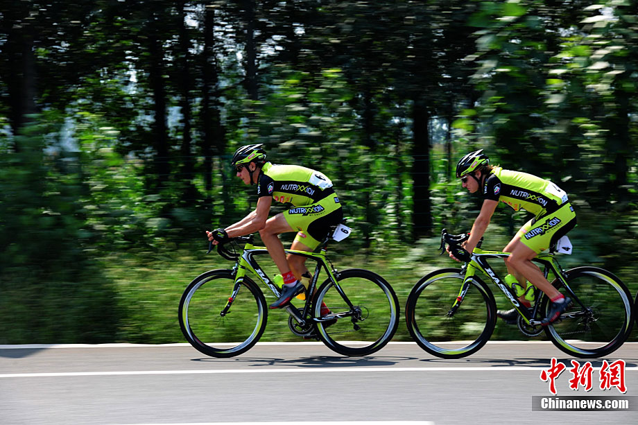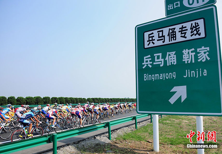 9月12日上午,首屆環(huán)中國國際公路自行車賽進(jìn)入第二賽段,由西安前往華山,全程118公里。圖為德國紐特里什車隊的一些選手們在高速公路上飛速前進(jìn)。中新社記者 侯宇 攝