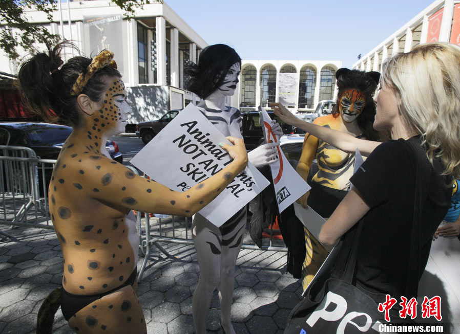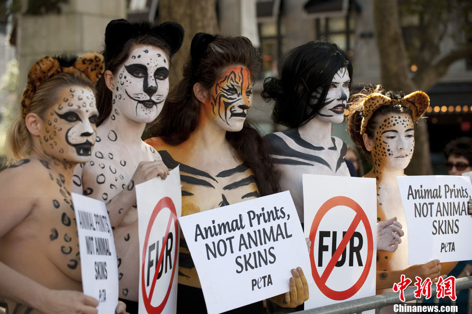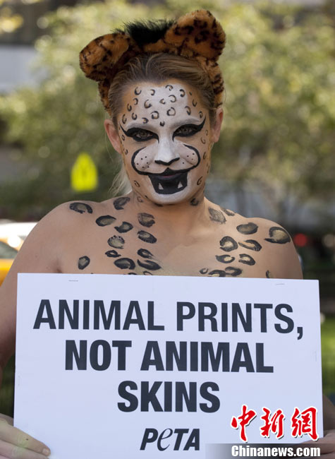 9月14日,在紐約時(shí)裝周進(jìn)行期間,幾位環(huán)保愛好者在身上涂畫“動(dòng)物彩繪”,呼吁保護(hù)動(dòng)物,愛護(hù)環(huán)境。