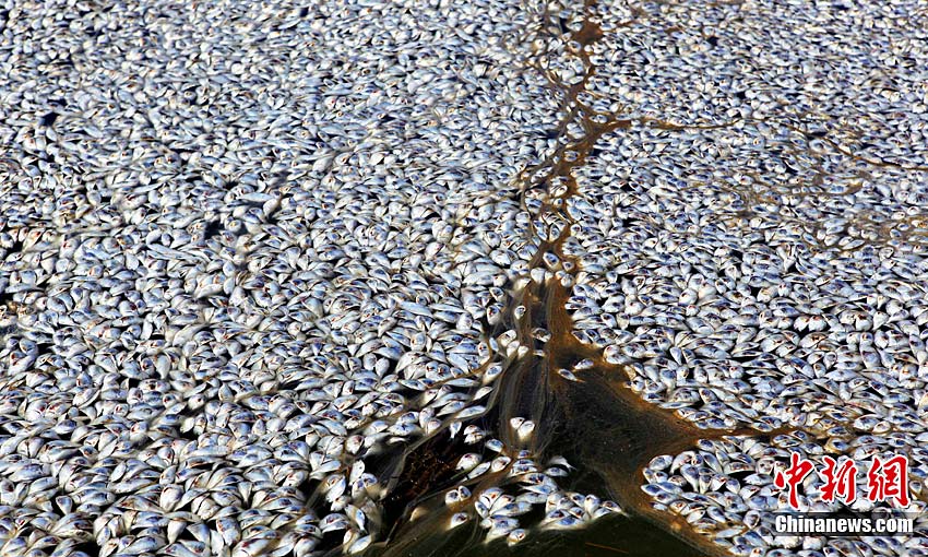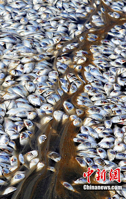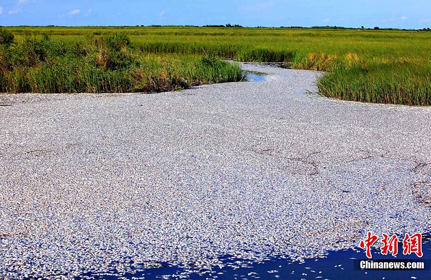近日,人們在美國路易斯安那州普拉克明縣發(fā)現(xiàn)大批漂浮在緩流溪上的死亡魚群。目前,這批魚的死亡原因不明,但懷疑與墨西哥灣漏油事件有關(guān)。圖為9月10日在美國路易斯安那州普拉克明縣拍攝的大批死魚。