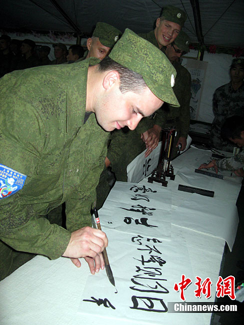 9月20日是“和平使命-2010”聯(lián)演確定的中國民族文化日,當(dāng)?shù)貢r(shí)間黃昏時(shí)分至晚上,哈薩克斯坦、俄羅斯、塔吉克斯坦、吉爾吉斯斯坦參演部隊(duì)官兵應(yīng)邀先后來到中方野戰(zhàn)兵營內(nèi)的“民族文化屋”帳蓬,觀賞、體驗(yàn)博大精深的中國文化。圖為中方參演官兵現(xiàn)場(chǎng)揮毫并將書法作品贈(zèng)送給哈方官兵。中新社記者 孫自法 攝