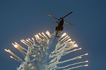 9月24日,“和平使命—2010”聯(lián)合反恐軍事演習(xí)實(shí)兵演練在哈薩克斯坦南部馬特布拉克諸兵種合成訓(xùn)練場舉行。圖為空軍戰(zhàn)斗群二架完成任務(wù)殲十戰(zhàn)機(jī)返回時(shí)釋放干擾彈。陶宏祥 攝 圖片來源:中廣網(wǎng)