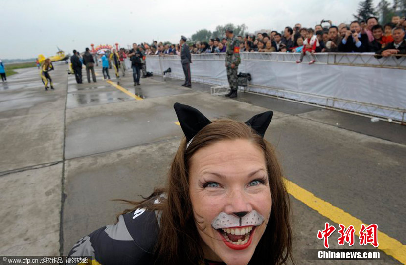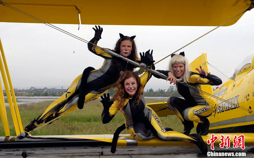 2010年9月30日,2010年首屆中國(重慶)國際飛行愛好者年會暨國際通用航空器展示交易會在重慶梁平縣開幕。雖本場航空表演僅對專業(yè)人士開放,仍然吸引了3萬人涌進梁平機場。圖為瑞典貓女郎準(zhǔn)備進行“機翼行走”特技表演。圖片來源:CFP視覺中國