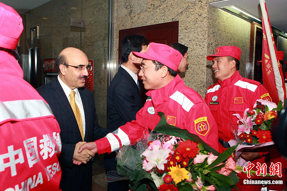 10月4日,中國國際救援醫(yī)療隊圓滿完成任務,結束了在巴基斯坦為期40天的國際人道主義援助,于當日10時左右抵達北京首都國際機場。經(jīng)過近40天的努力,兩批救援醫(yī)療隊共診治患者25664人次,開展手術100余例,已經(jīng)圓滿完成了這次國際救援任務,受到聯(lián)合國衛(wèi)生組織、巴基斯坦政府和當?shù)鼗颊叩母叨荣澴u,較好地展示了救死扶傷的國際人道主義精神,彰顯了中國的良好形象,為中巴友誼賦予了新的內(nèi)涵。圖為首席醫(yī)療官、武警總醫(yī)院副院長梁立武帶領救援隊勝利凱旋。中新社發(fā) 姚洪華 攝