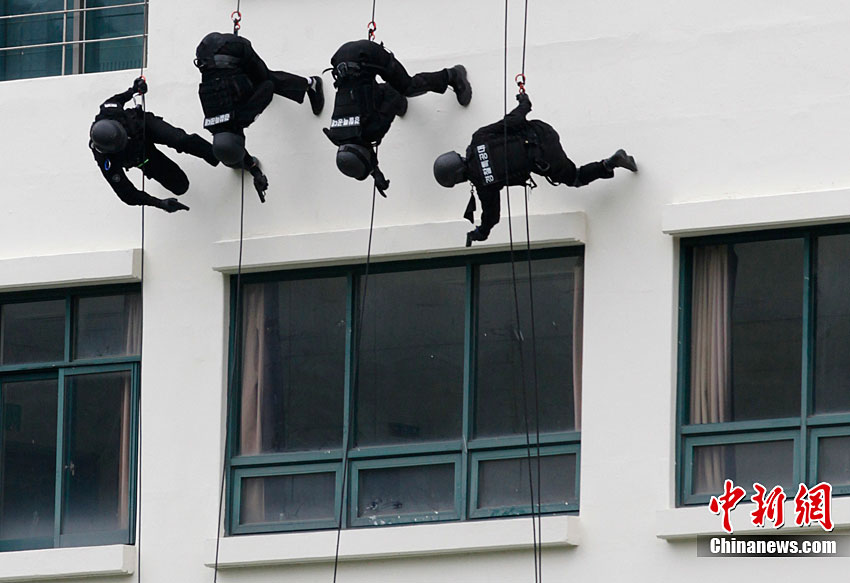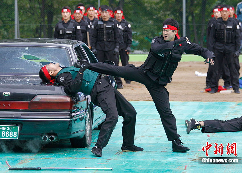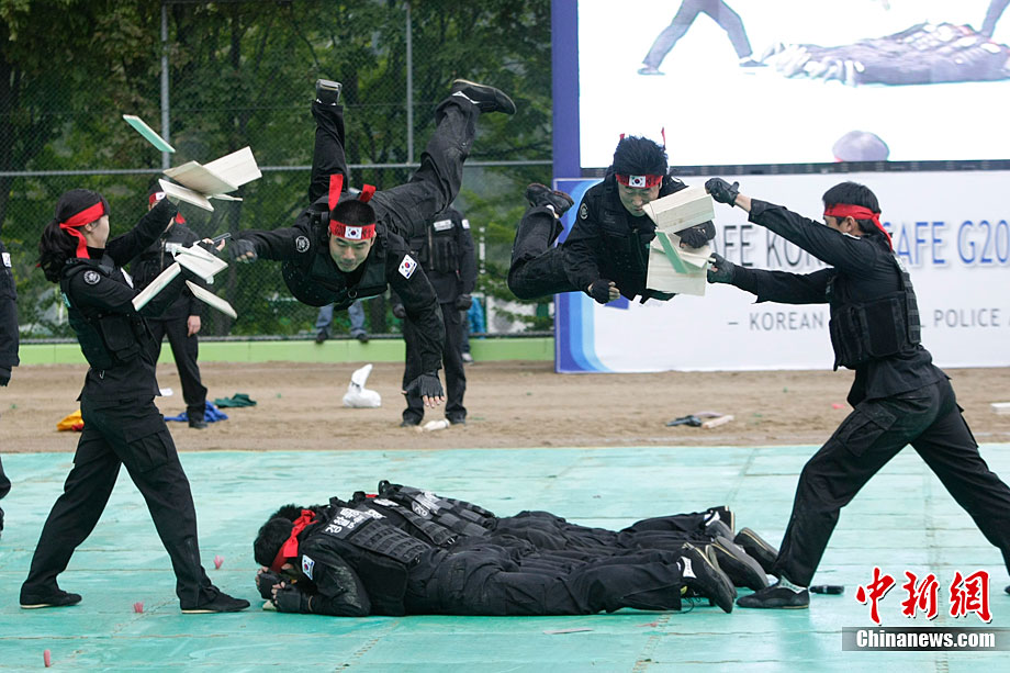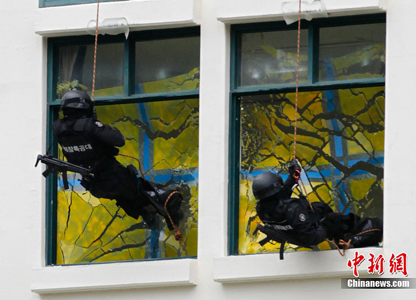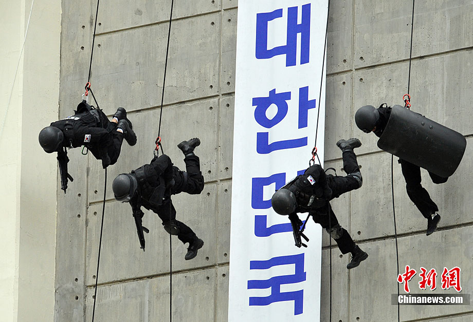 當(dāng)?shù)貢r間10月4日,韓國特警在首爾舉行了反恐演習(xí)。此次演習(xí)是為了即將于11月在韓國舉行的G20首腦峰會而做的準備工作。