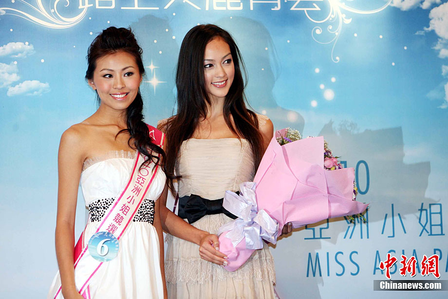 10月5日,參加《2010亞洲小姐競選--港澳賽區(qū)》的佳麗在香港一家酒店登臺亮相,與大會形象顧問團成員會面。圖為6號佳麗李瑩瑩向形態(tài)顧問Jessica C獻(xiàn)花。中新社發(fā) 洪少葵 攝
