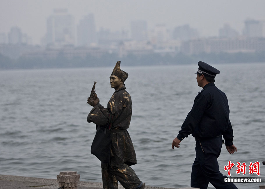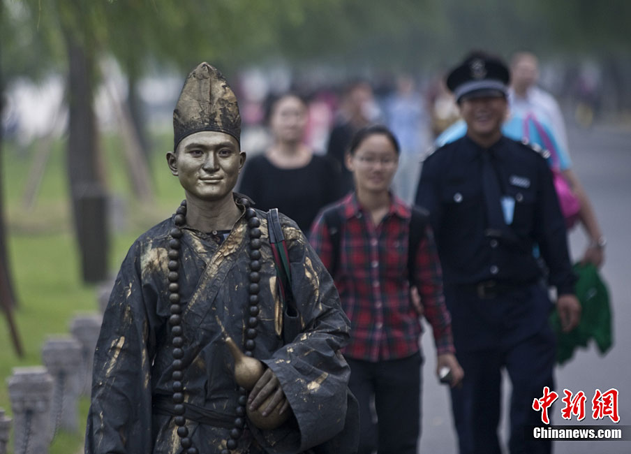 2010年10月上旬,一名打扮成濟(jì)公模樣的人在浙江省杭州市西湖白堤和游客合影,“濟(jì)公”身上涂滿(mǎn)了銅顏色的彩繪,看上去像雕塑一樣。據(jù)悉,這位20多歲“濟(jì)公”來(lái)自江蘇,從今年春天開(kāi)始扮成“濟(jì)公”,在全國(guó)游走。和他合影需要交5元錢(qián)。許康平 攝 圖片來(lái)源:cnsphoto