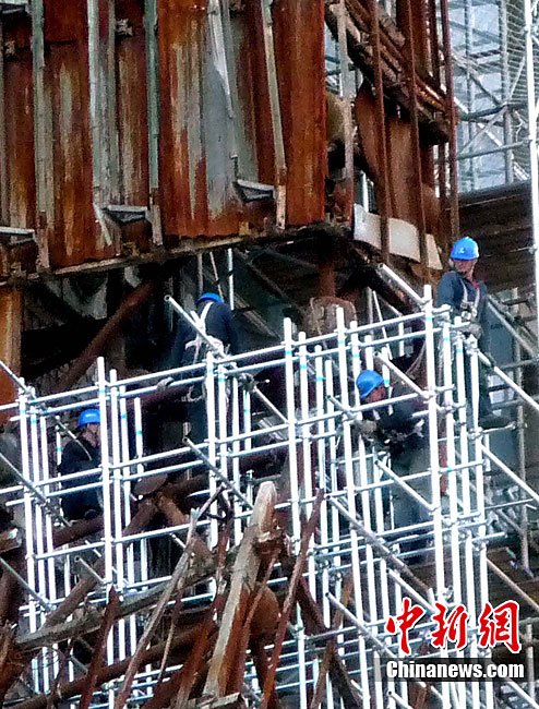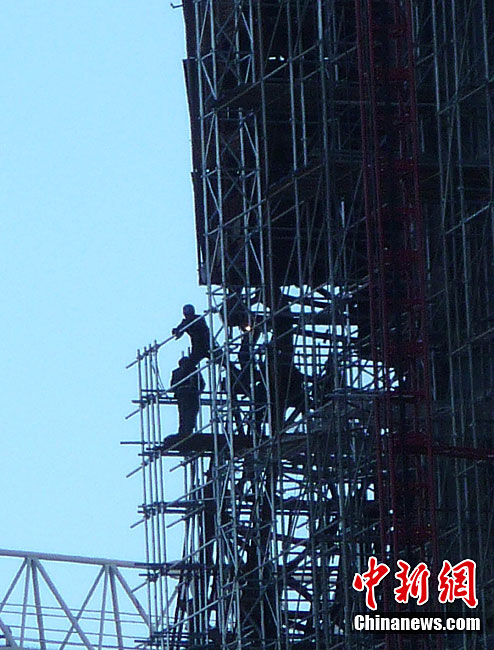 10月14日,北京央視新址,過火樓四周已開始搭起腳手架,更換外立面。與此同時(shí),施工方已開始拆除被燒毀的合成玻璃,下月起全部更換。2009年元宵節(jié),未交工的央視新址北配樓曾燃大火,2010年8月該樓開始啟動(dòng)整修。祥云 攝 圖片來源:cnsphoto