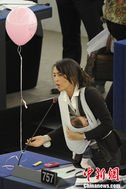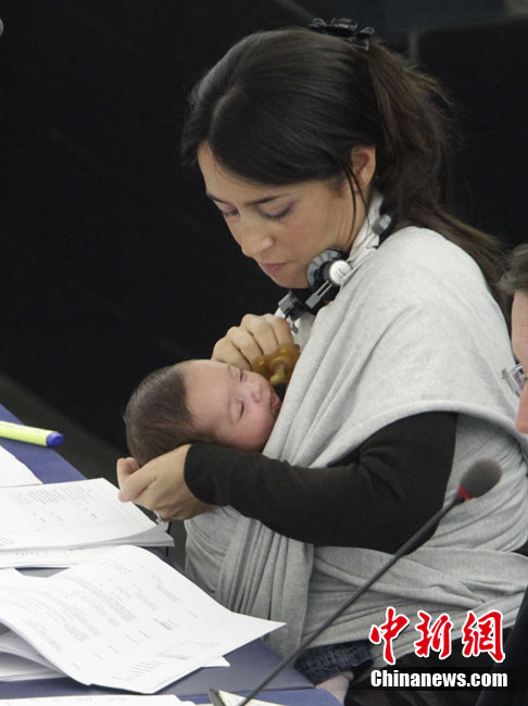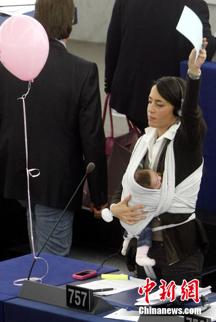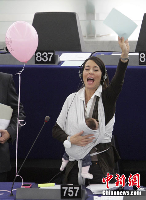 10月20日,歐洲議會在法國的斯特拉斯堡為延長產(chǎn)假的提案舉行投票,代表麗希亞·隆蘇依帶著孩子出席會議。