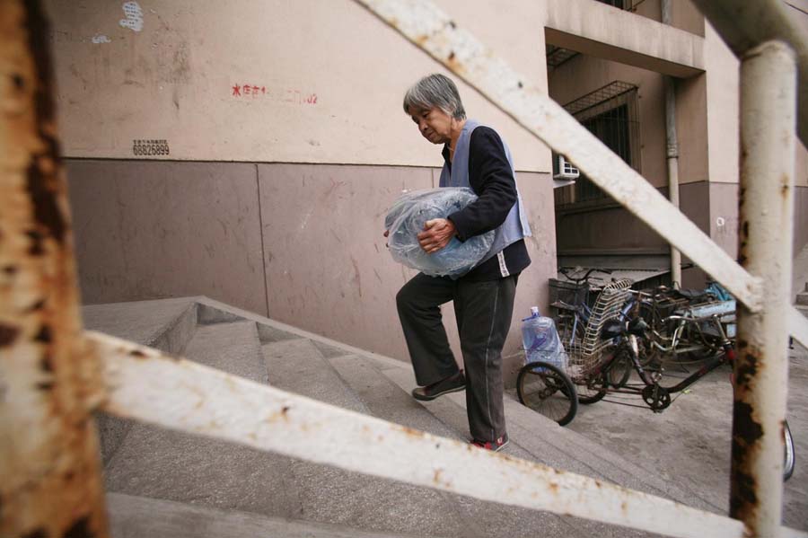 年至七旬的高美運,為了糊養(yǎng)全家、為兒孫治病,每天都要重復(fù)這個動作近百次。40斤的水桶在這個只有75斤的老人面前,實在是太沉了。為了養(yǎng)活身殘的兒子和智障的孫子,七十歲的老人高美運獨自扛起了養(yǎng)活一家人的重擔(dān)。為了生計,她開了一家水站,成了石景山區(qū)楊莊中區(qū)社區(qū)里有名的“送水老太太”。