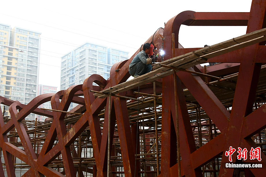 近日,北京通惠河南岸的慶豐公園東側(cè),一座面積約300平方米、三層樓高的建筑,以其酷似國家體育場“鳥巢”的造型吸引了不少人的目光。據(jù)悉,該建筑是正在建設(shè)中的通惠時尚國際廣場的配套建筑。10月20日上午,國家體育場的工作人員已到現(xiàn)場取證,將研判是否涉嫌侵權(quán)。中新社記者 富田 攝
