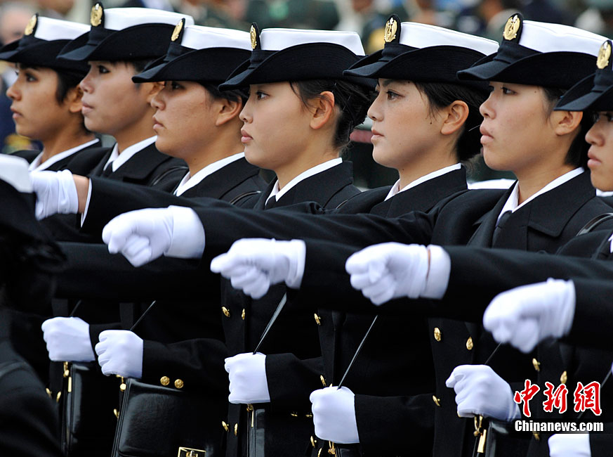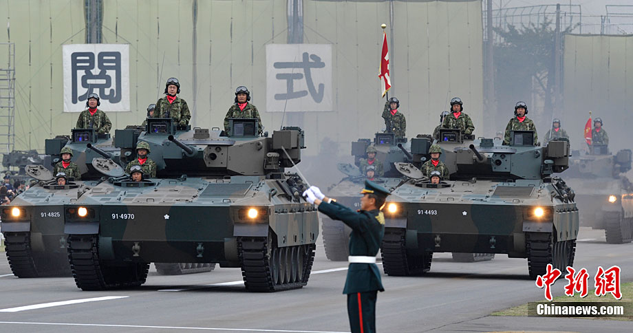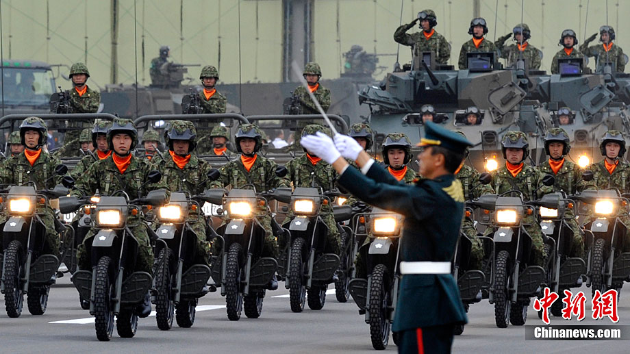 10月24日,日本自衛(wèi)隊(duì)在位于埼玉縣的朝霞訓(xùn)練場舉行了三年一度的海陸空閱兵式,首相菅直人檢閱了部隊(duì)并訓(xùn)話。參加本次閱兵式的自衛(wèi)隊(duì)員共有3800余人,分別來自海、陸、空3軍的26支部隊(duì)。閱兵式上,自衛(wèi)隊(duì)展示了各式戰(zhàn)機(jī)60余架,坦克、裝甲車等240輛。