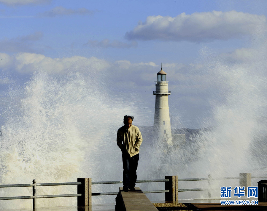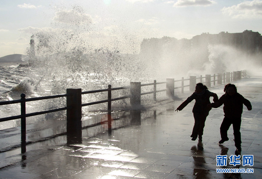 10月25日,一名行人從山東威海海濱掀起的浪花旁走過。當日,受強冷空氣影響,山東威海海上風力達8至9級,陣風風力達到11級,海濱大浪排空,威海市海上搜救中心發(fā)布海上風險黃色預警。于啟波 攝 圖片來源:新華網(wǎng)