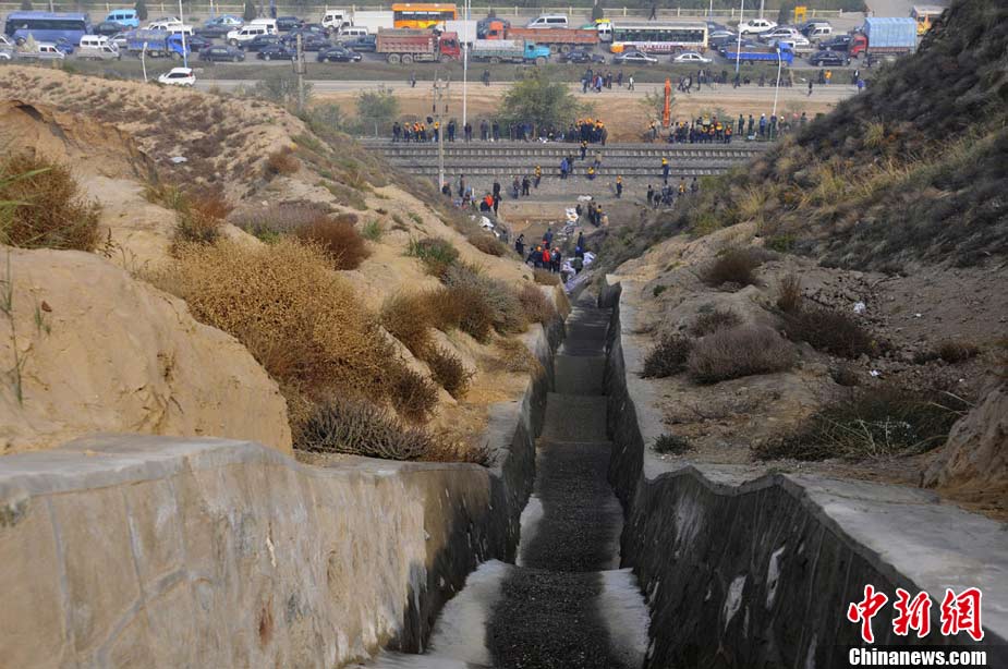 10月30日早晨,蘭新鐵路線遭水害遇險情,蘭新線K8+500米處南側山上,有廢水從山體沖下,將蘭新線上下行路基沖穿,嚴重危及行車安全。根據(jù)鐵路部門的測量,上行路基一側被沖塌形成了50立方米的坑,下行路基一側沖塌形成的坑有24立方米。蘭州鐵路局等組織7臺大型機械,共有700多人投入搶險。經(jīng)全力奮戰(zhàn),11時整,蘭新線下行線路開通;11時15分,蘭新線上行線路開通。楊艷敏 攝